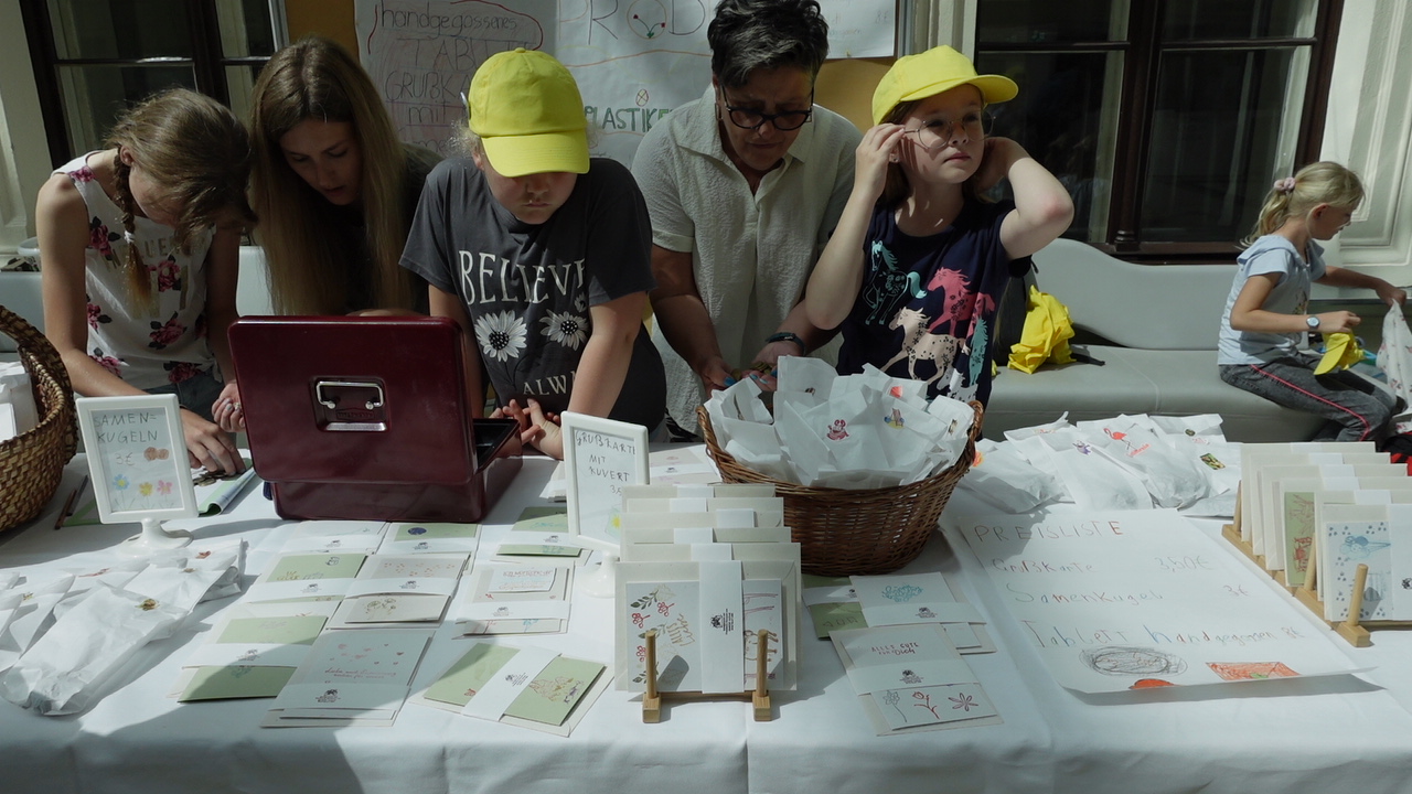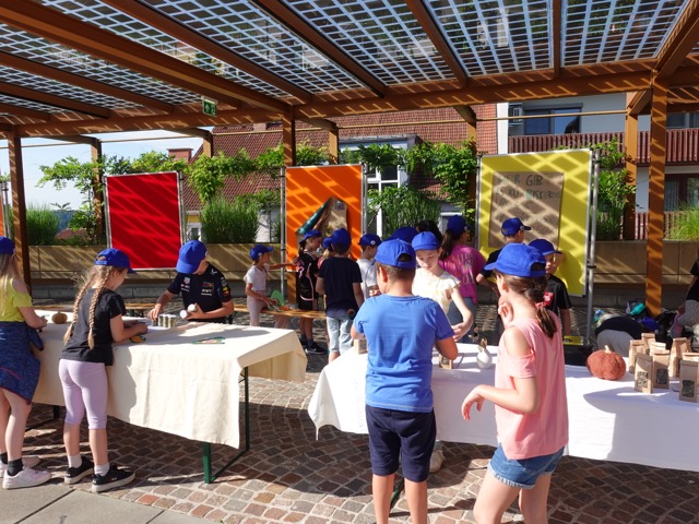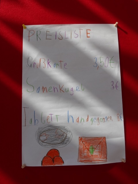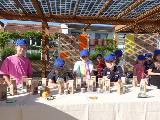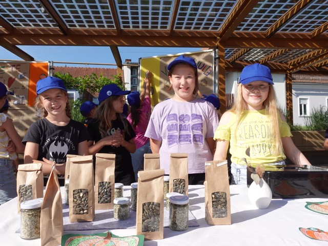 Für dieses Projekt stellte die 3a mit Frau Theißl Kürbiskernsalz und geröstete Kürbiskerne her. Die 3b war bei „Unsere kleine Bastelstube“ und sie gossen Tabletts. Sie bestempelten auch Grußkarten.