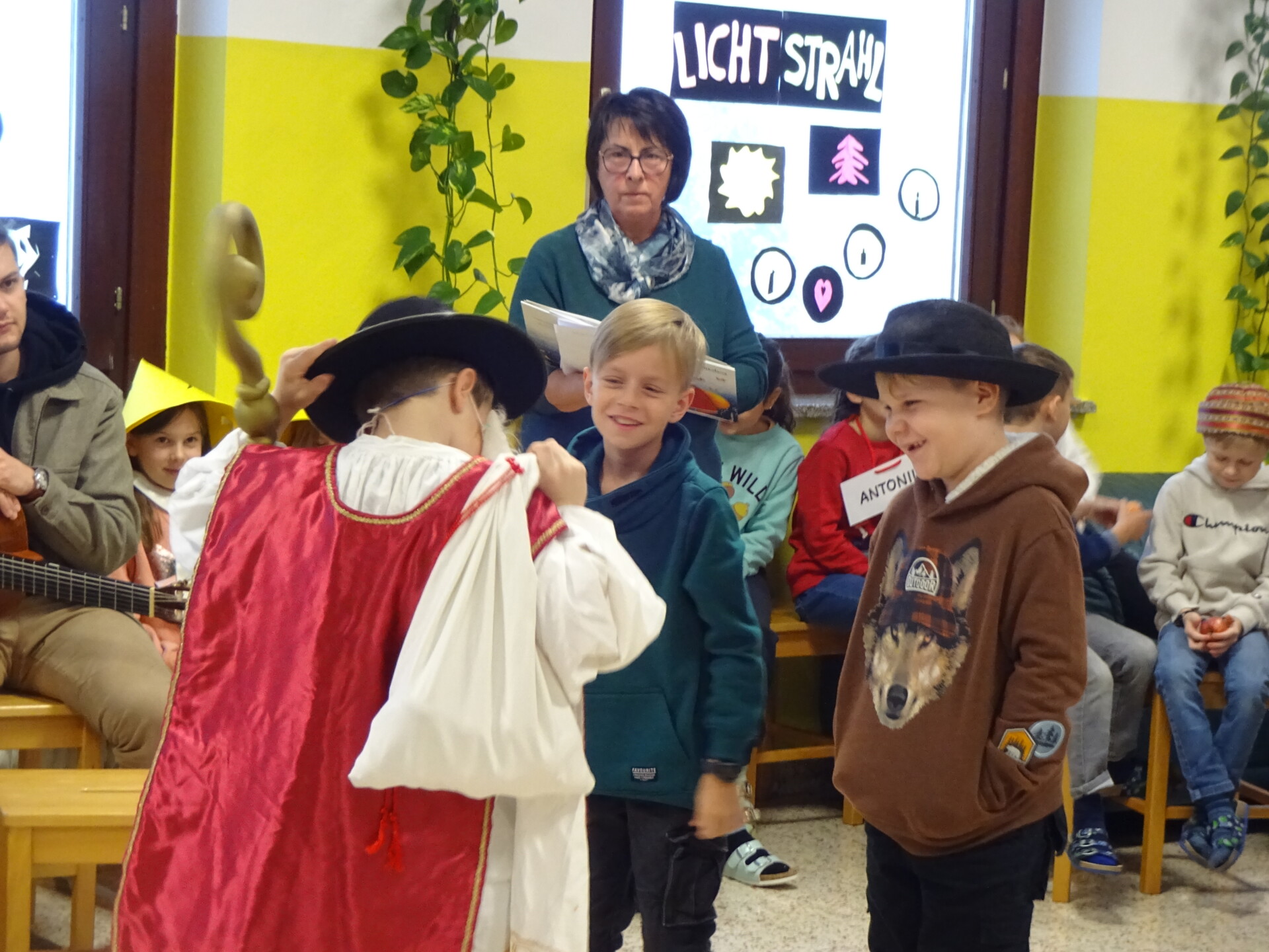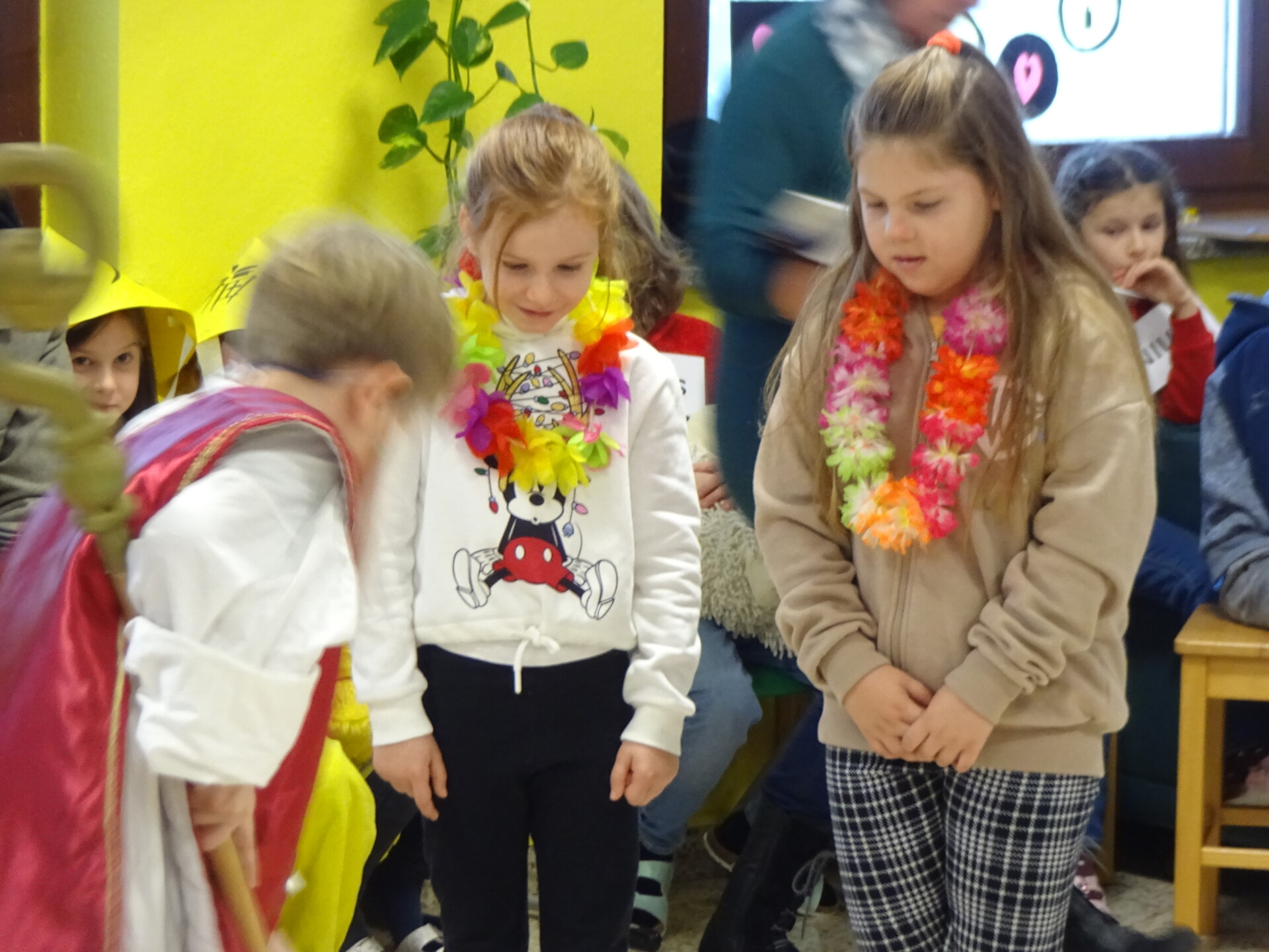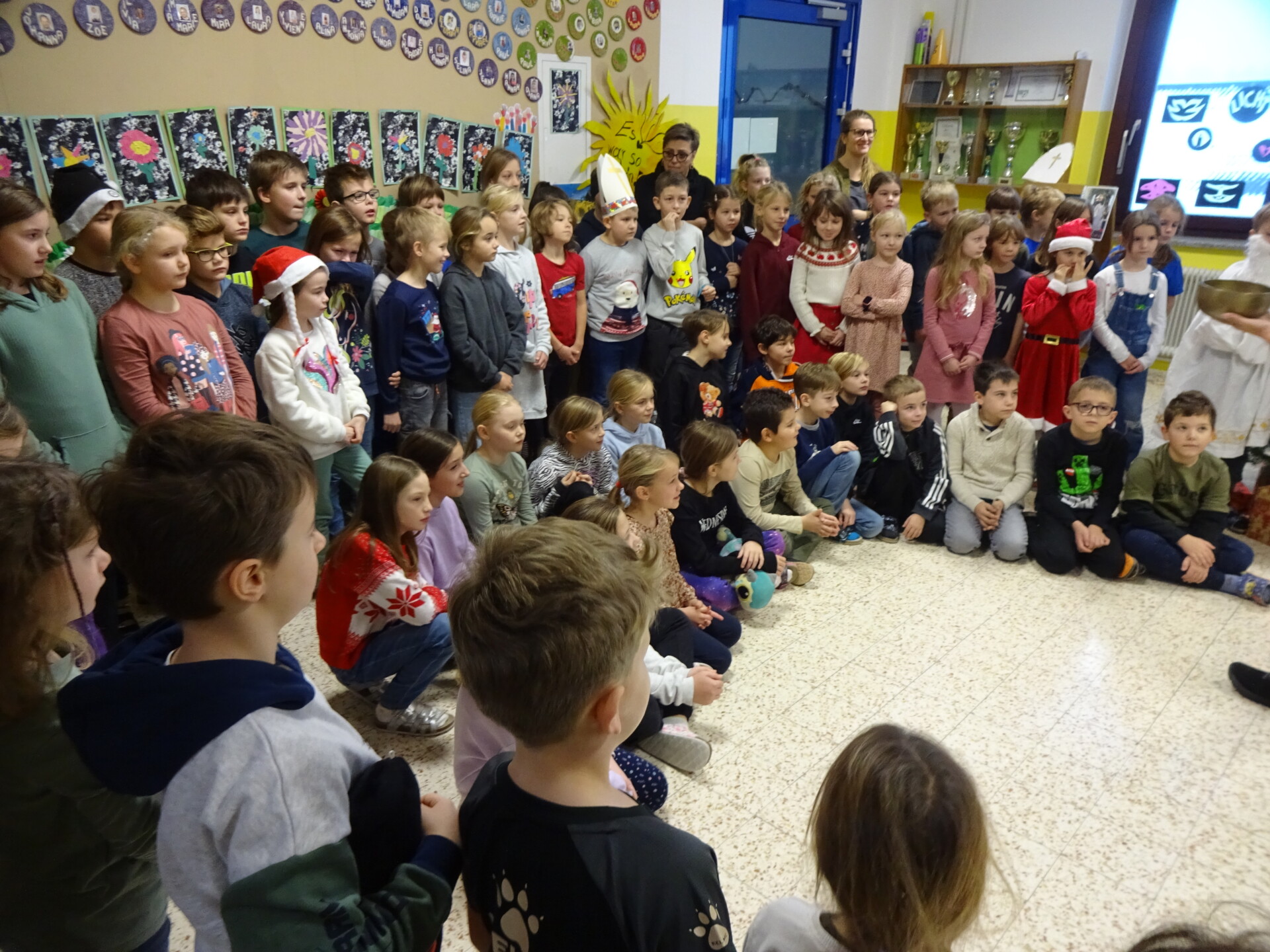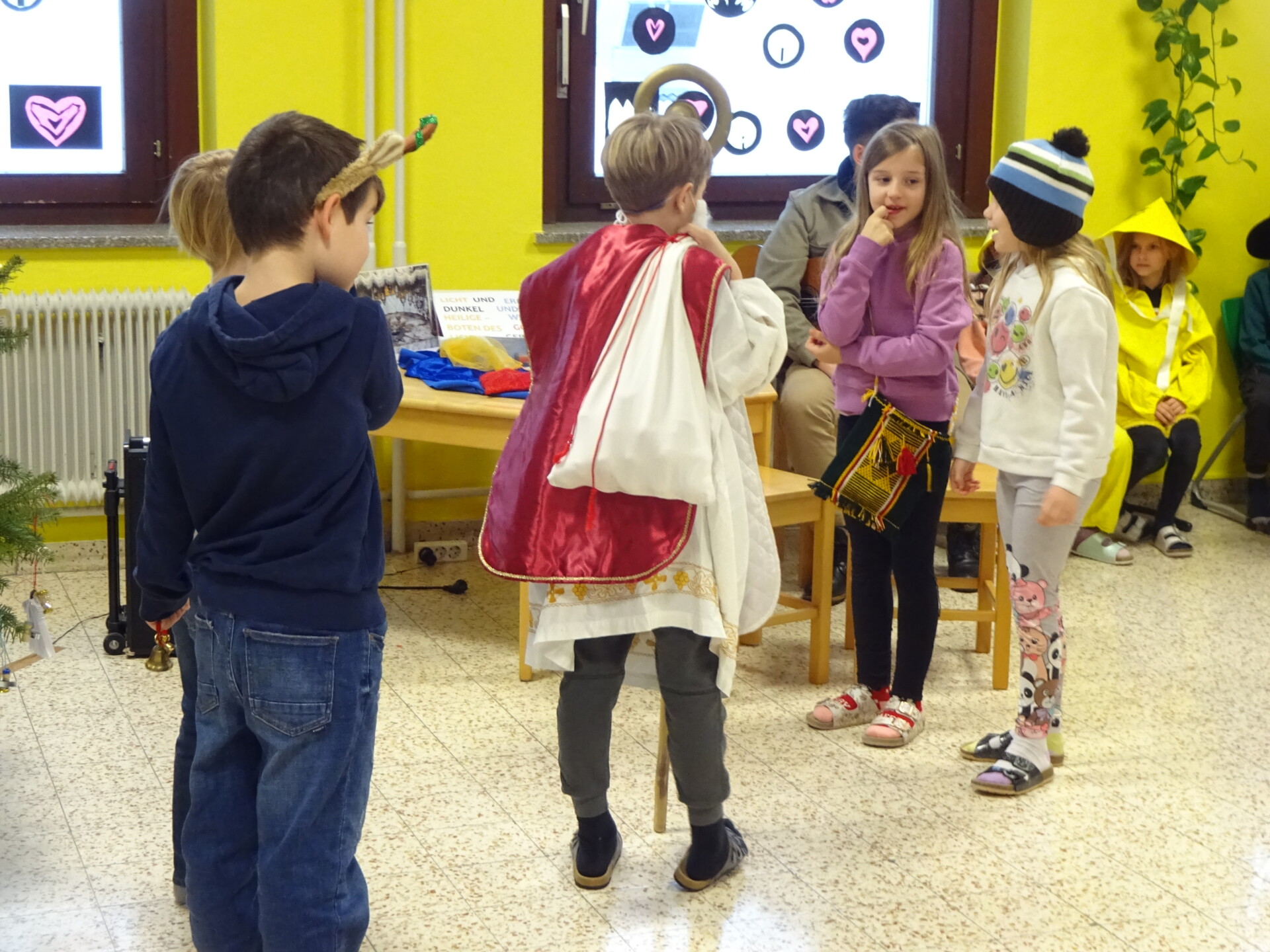 Die Kinder der 2a Klasse führten ein Theaterstück auf, bei dem es um die Suche nach der Mütze ging, die der Nikolaus verloren hatte. Gemeinsam wurden Lieder gesungen, in allen Klassen wurden essbare Krampusse verteilt.