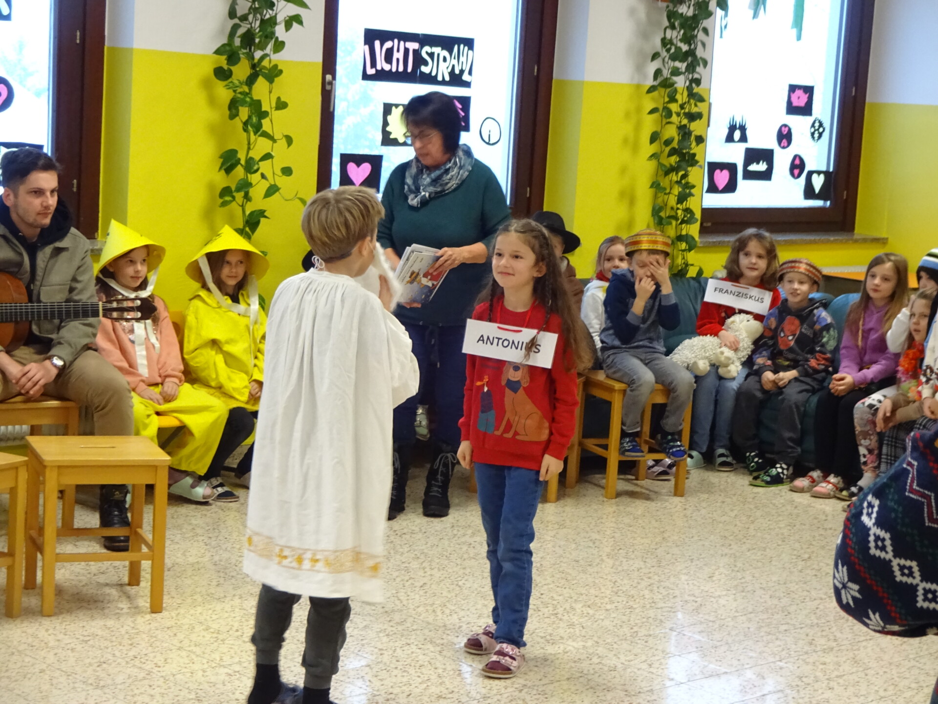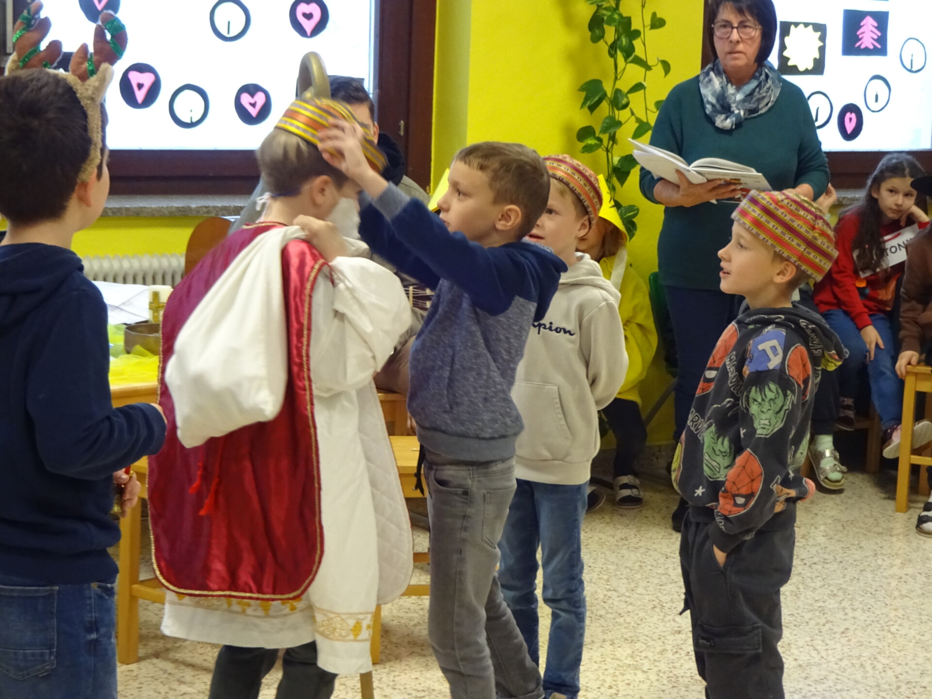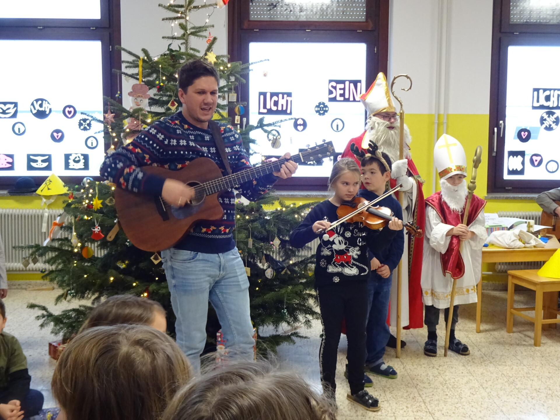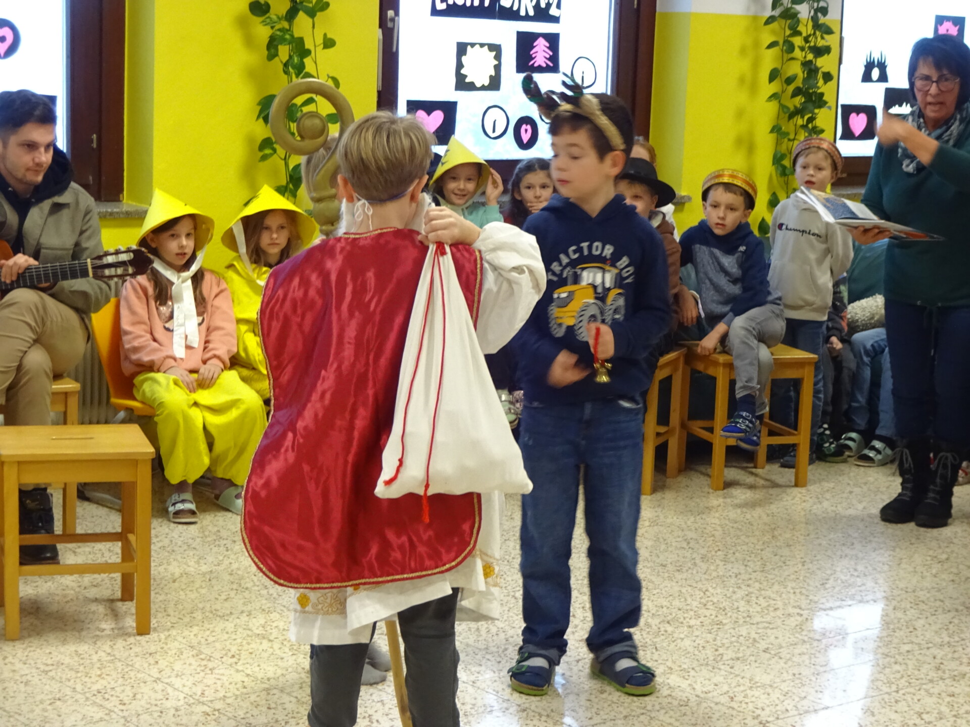 Die Kinder der 2a Klasse führten ein Theaterstück auf, bei dem es um die Suche nach der Mütze ging, die der Nikolaus verloren hatte. Gemeinsam wurden Lieder gesungen, in allen Klassen wurden essbare Krampusse verteilt.