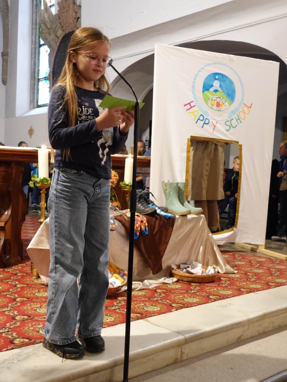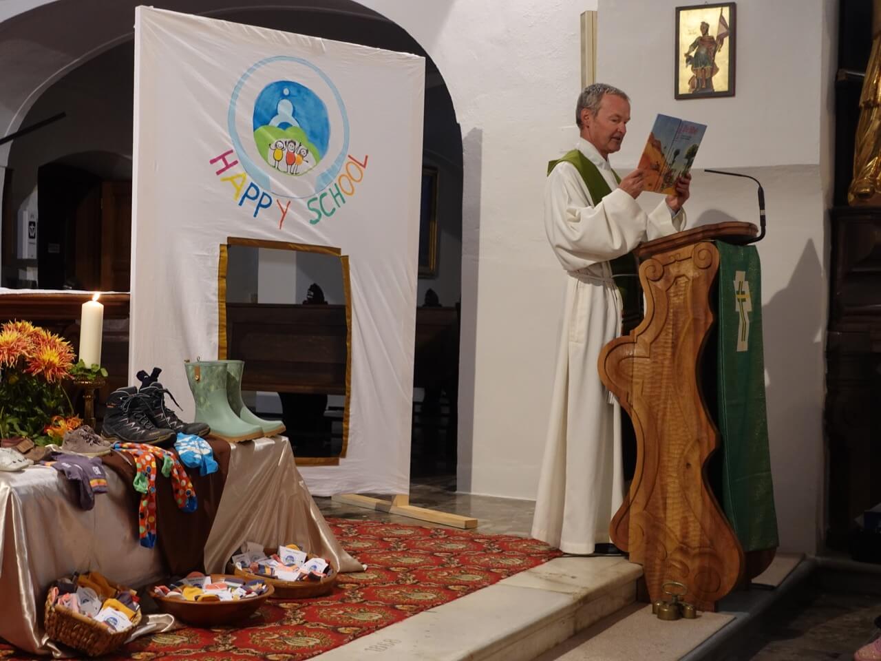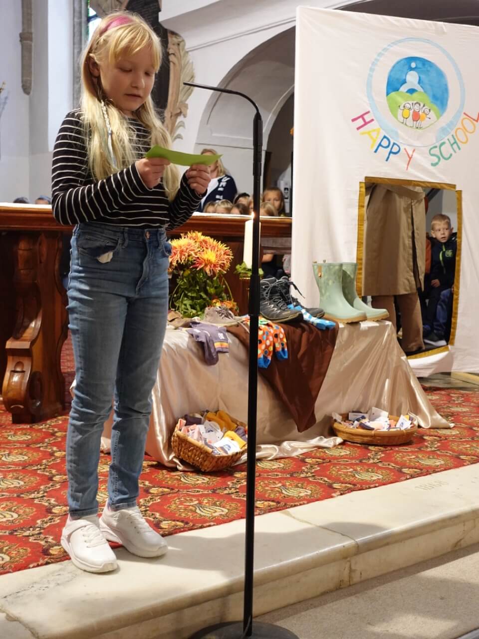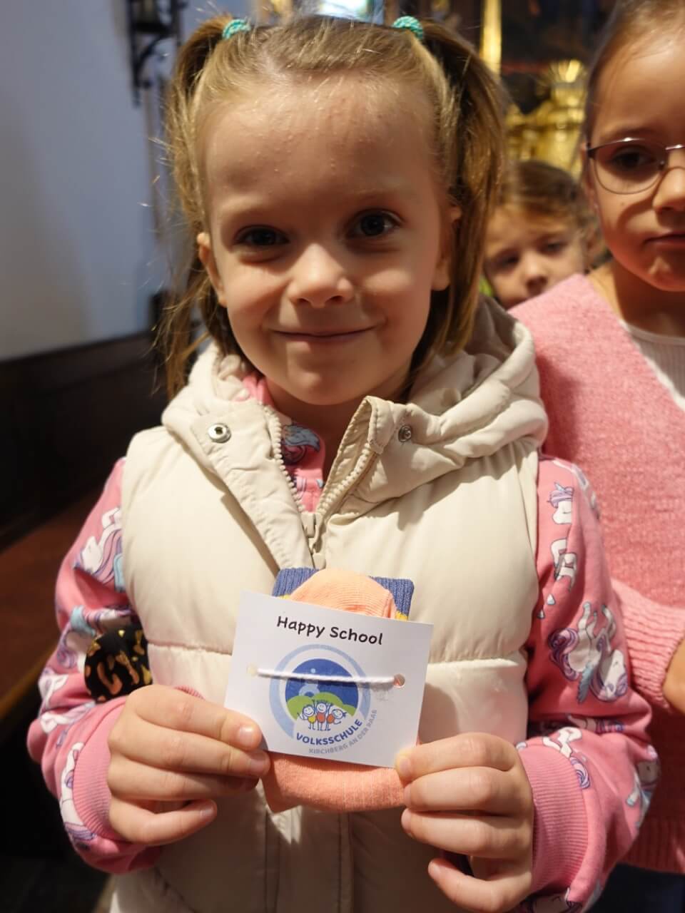 Unsere Erstklässler wurden beim Eröffnungsgottesdienst von allen Kindern und nochmals vom ganzen Schulteam herzlichst begrüßt und willkommen geheißen. Symbolisch sind die Erstklässler durch ein Durchgehtuch „Happy School“ gegangen. Für diesen neuen Lebensabschnitt hat Pfarrer Bernhard die Kinder gesegnet. Möge es ganz viele fröhliche, zufriedene und schöne Momente geben.