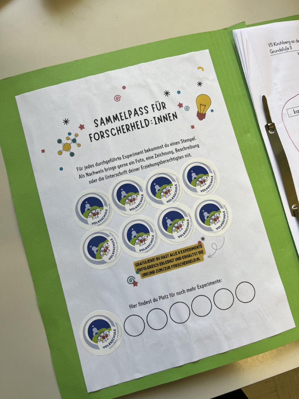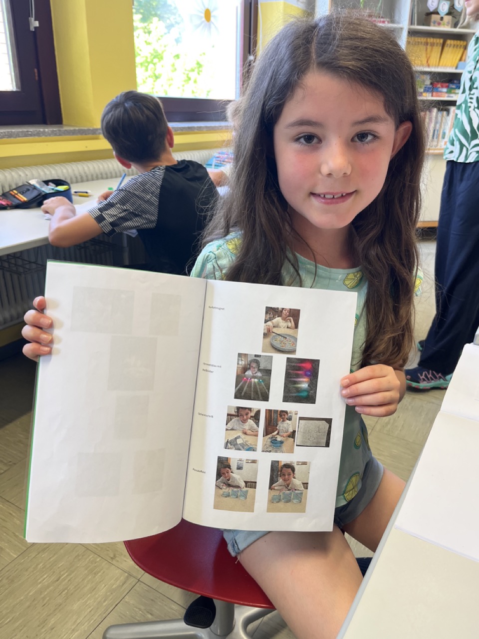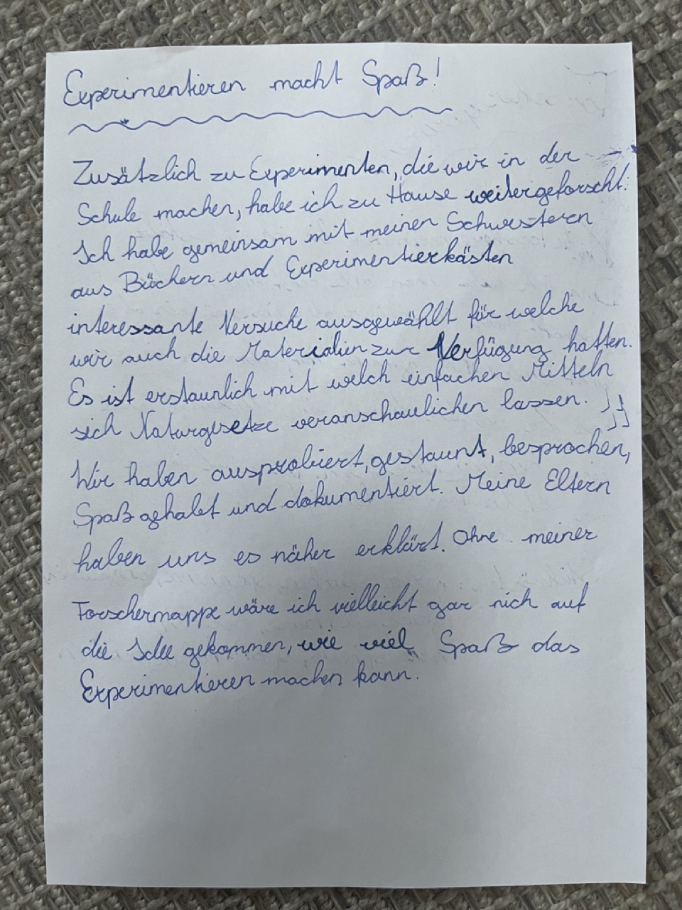 Zusätzlich zu Experimenten, die wir in der Schule machen, habe ich zu Hause weitergeforscht. Ich habe gemeinsam mit meinen Schwestern aus Büchern und Experimentierkästen interessante Versuche ausgewählt, für welche wir auch die Materialien zur Verfügung hatten. Es ist erstaunlich mit welch einfachen Mitteln sich Naturgesetzte veranschaulichen lassen. Wir haben ausprobiert, gestaunt, besprochen, Spaß gehabt und dokumentiert. Meine Eltern haben es uns näher erklärt. Ohne meine Forschermappe wäre ich vielleicht gar nicht auf die Idee gekommen, wie viel Spaß das Experimentieren machen kann.