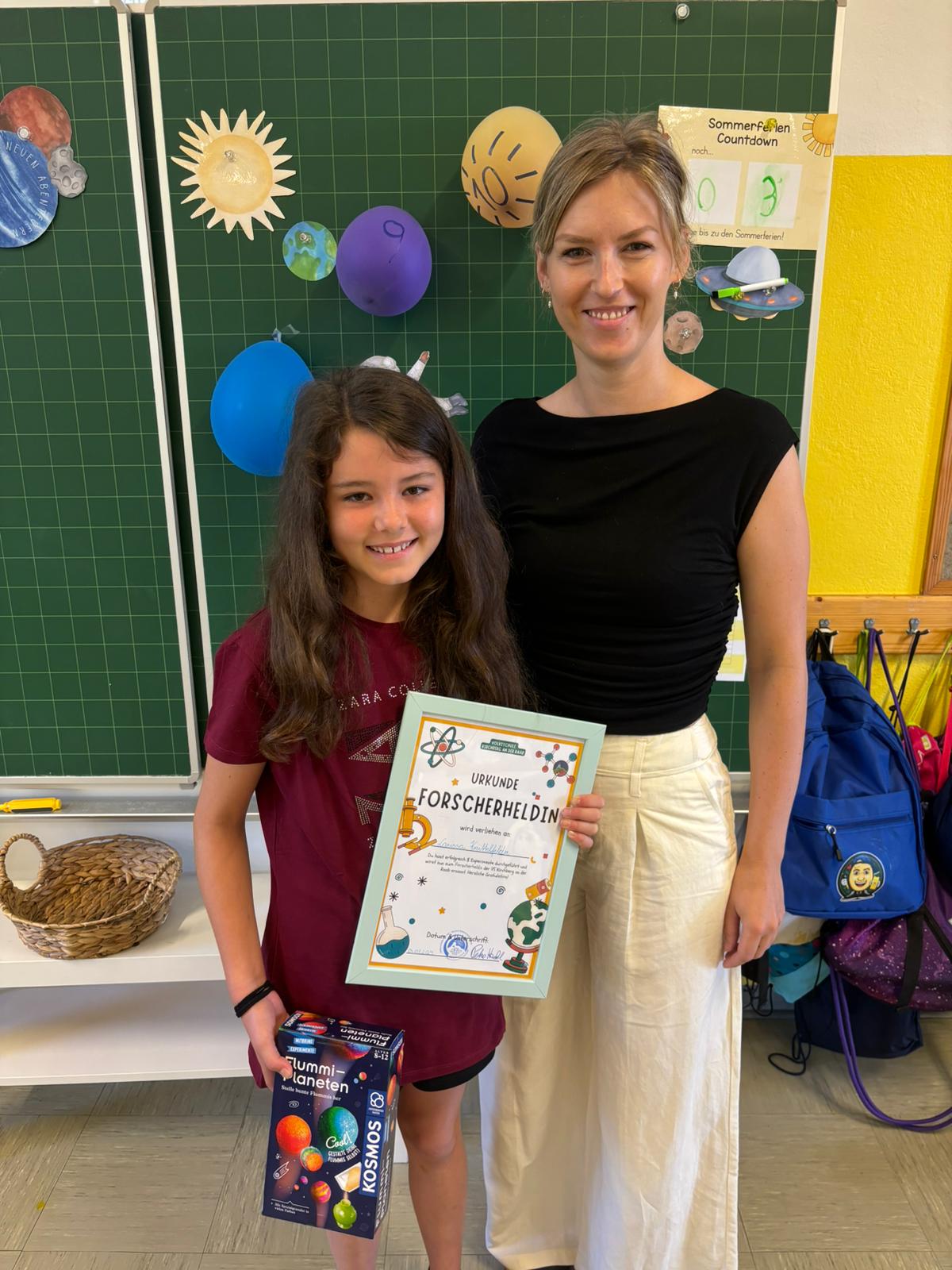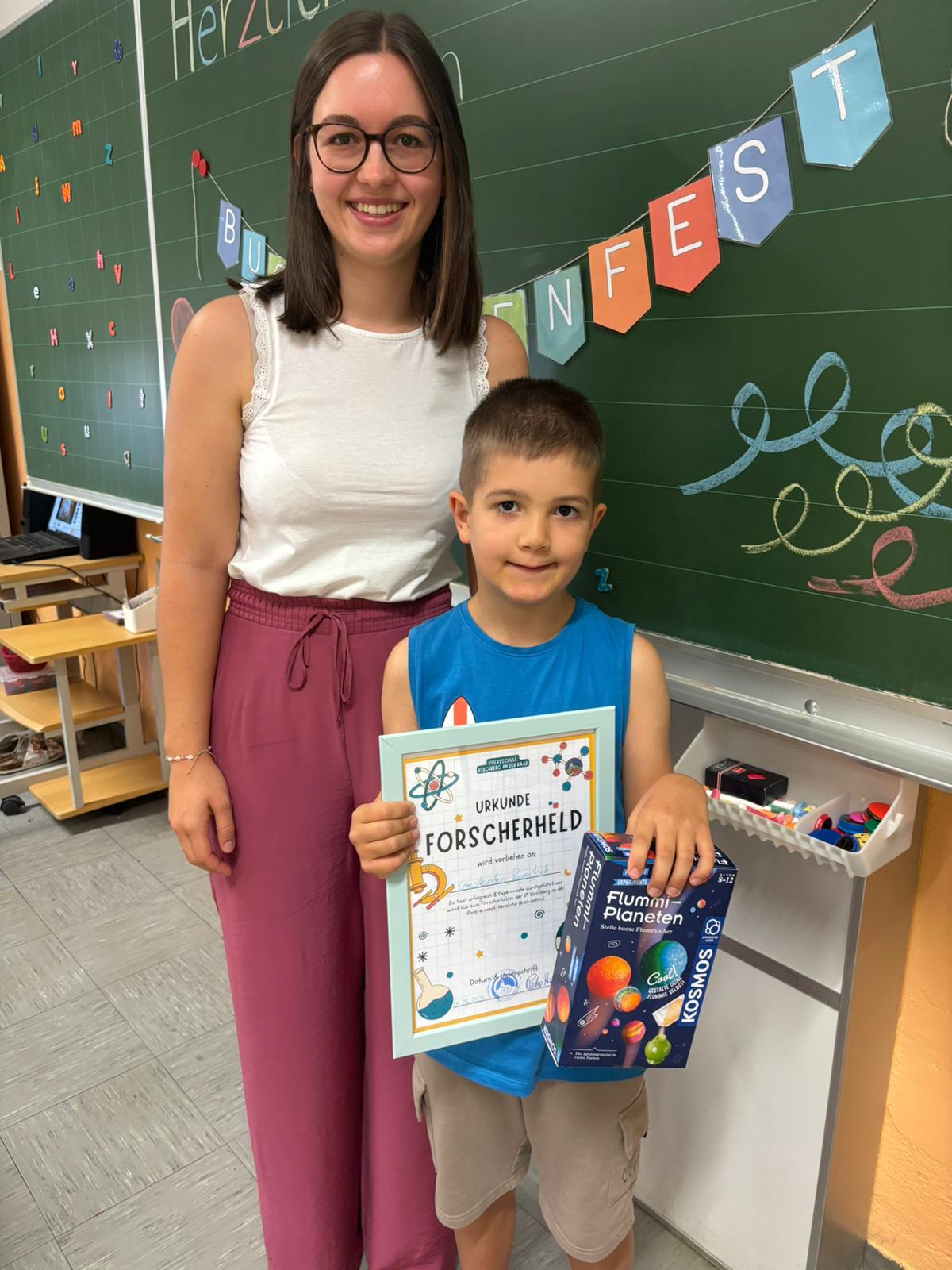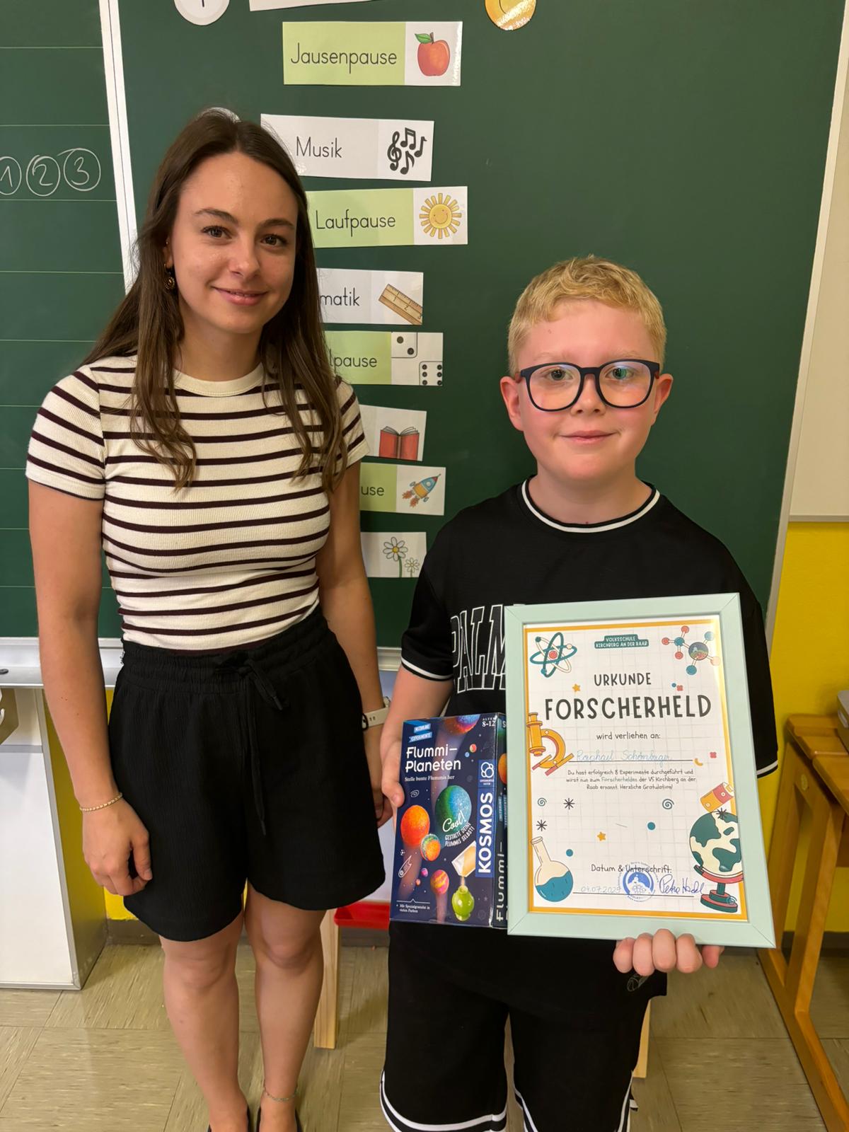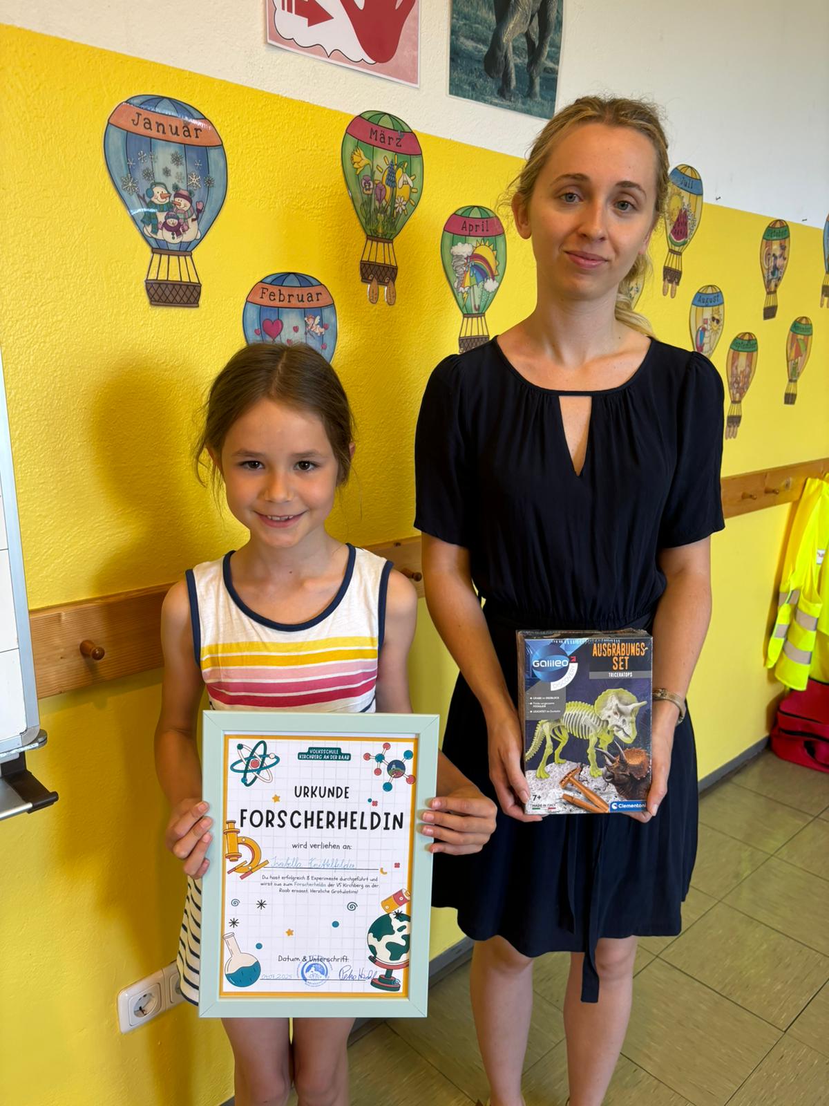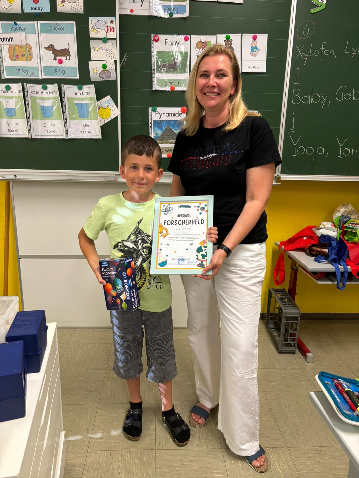 Die Auszeichnung zur „Forscherheld:in“ erhält man, wenn man in seiner Forschermappe 8 naturwissenschaftliche Experimente durchgeführt und dokumentiert hat.