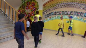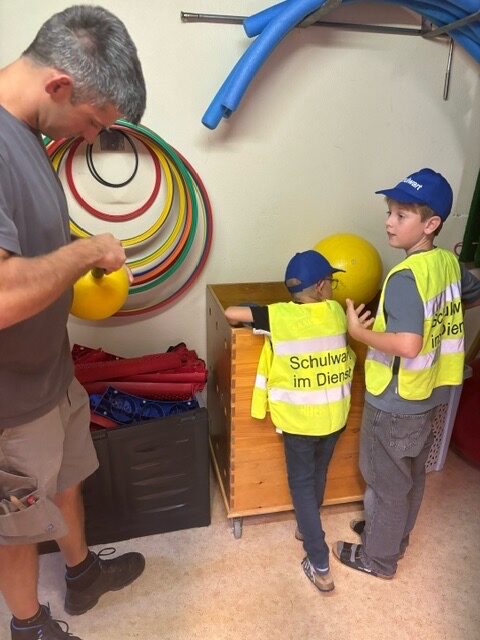 Besonders zu Beginn des Jahres stand das richtige Platzieren der Schulmöbel in den Klassenräumen sowie die Verteilung der Unterrichtsmaterialien im Vordergrund. Neben diesen organisatorischen Tätigkeiten gehört auch die Sicherheit an der Schule zu ihrem Verantwortungsbereich. Jede Schule ist verpflichtet, einmal jährlich eine Räumübung durchzuführen. Dabei gilt es, das Gebäude nach einem Warnsignal so rasch und geordnet wie möglich zu verlassen. Wichtig ist, dass jede Person genau weiß, welchen Ausgang sie im Ernstfall von jeder Position des Gebäudes aus zu benutzen hat. Da sich die Volksschule die Notausgänge auch mit den Schülerinnen und Schülern der Mittelschule teilt, ist hier besonders schnelles Handeln gefragt. Insgesamt verließen rund 500 Kinder und etwa 60 Erwachsene im Rahmen der Übung das Gebäude.