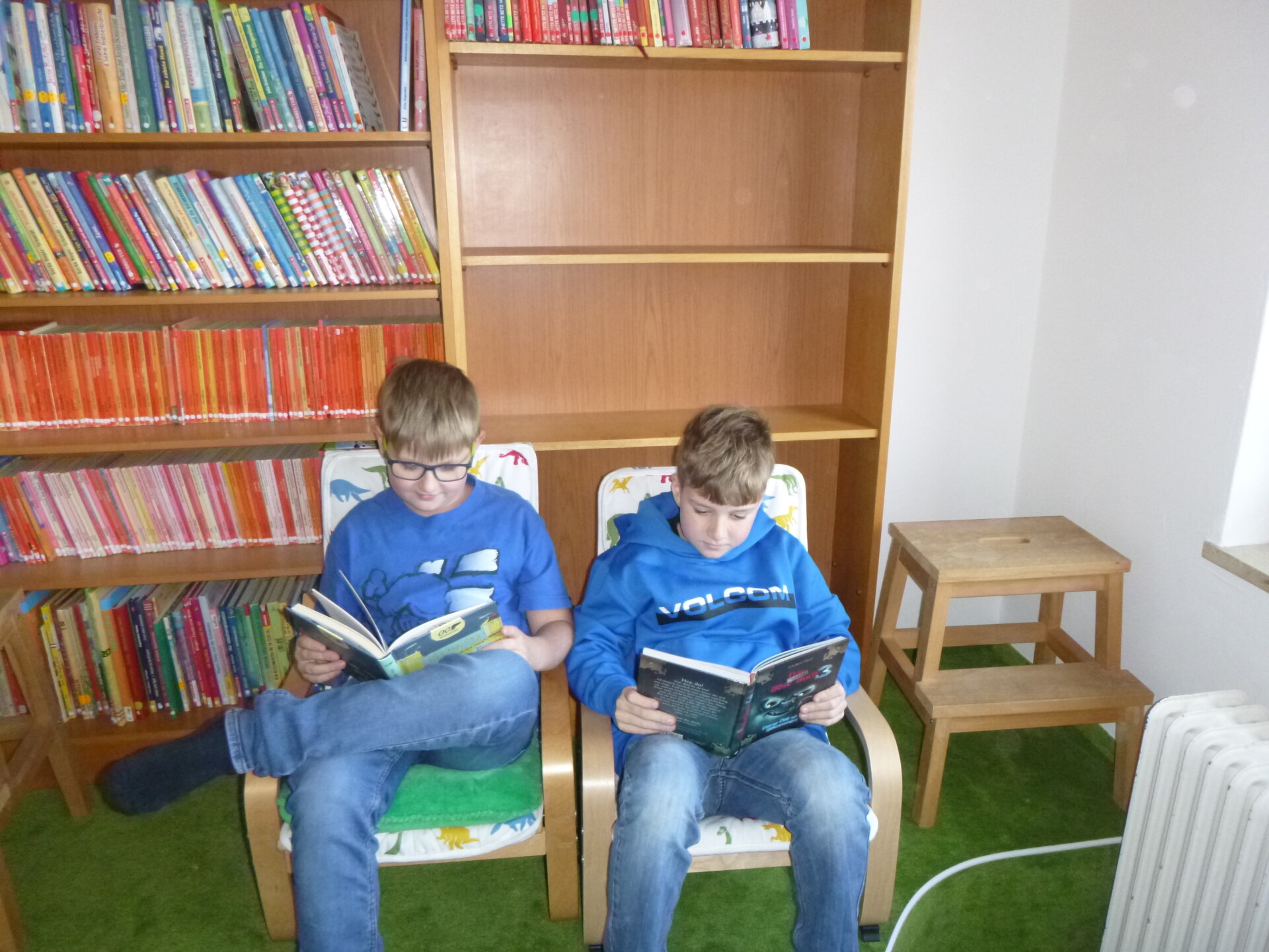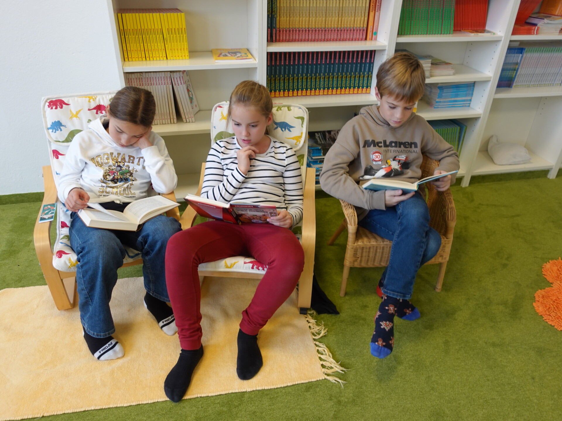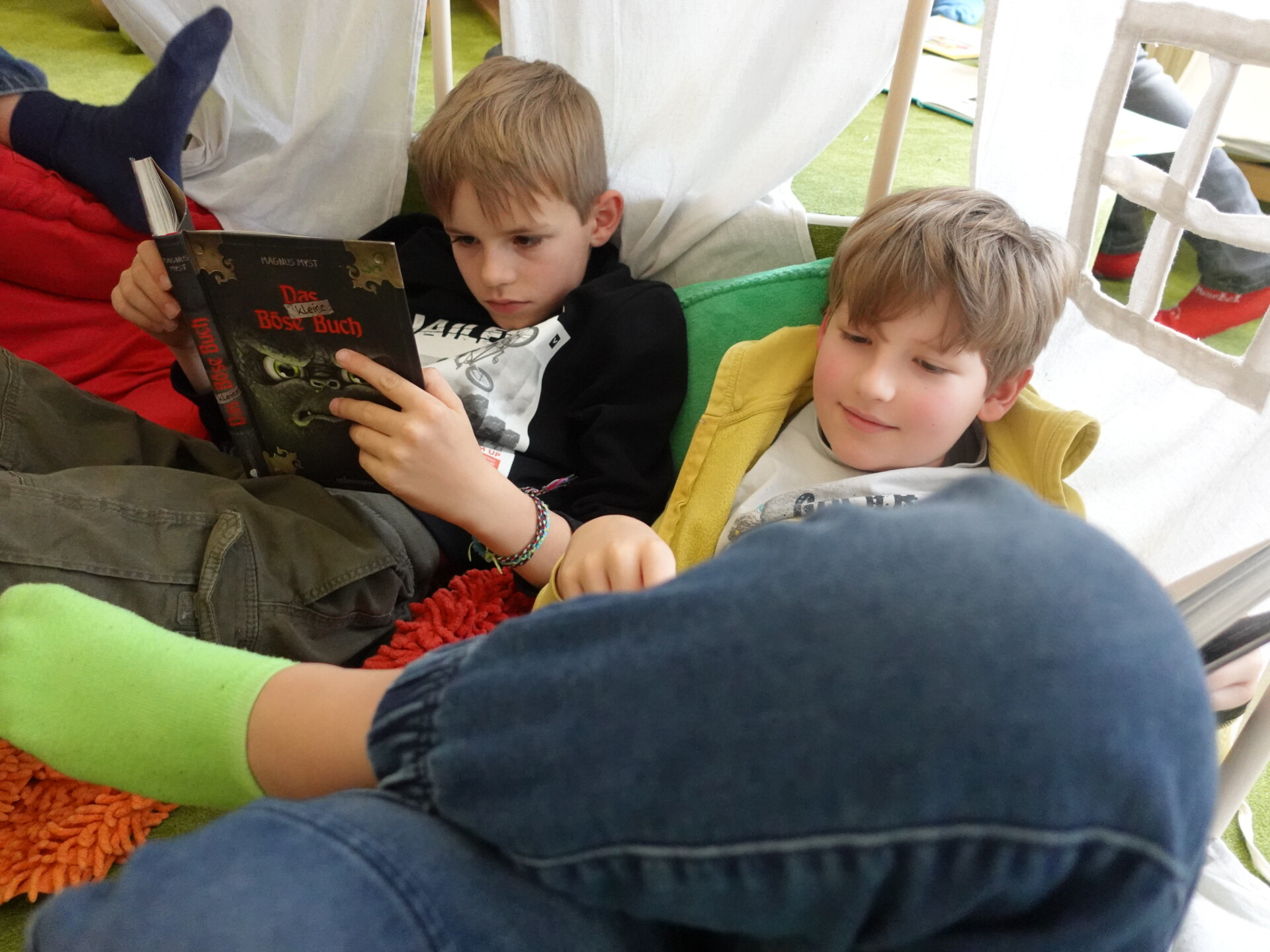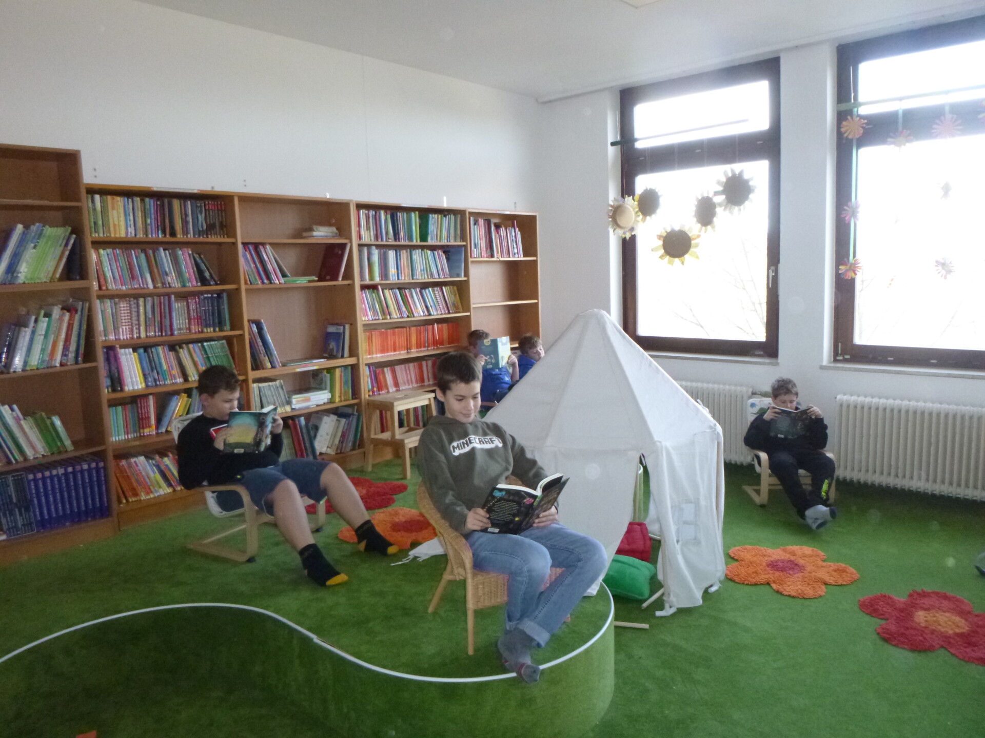 In unserer neuen, umfangreichen Schulbücherei, dem „Lesenest“, durften und dürfen die Kinder alles erfahren, was mit dem Thema Lesen zusammenhängt. Texte vorgelesen bekommen, zuhören, ruhig werden, selber lesen, liegend lesen, im Zelt lesen, in einer angenehmen Atmosphäre lesen, im Chor lesen, gemeinsam etwas vorlesen, Gelesenes umsetzen in Handlungen.