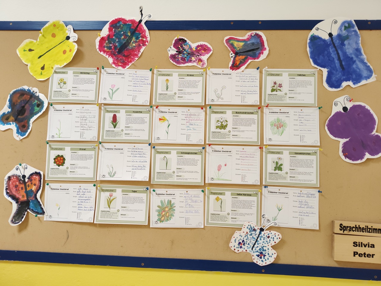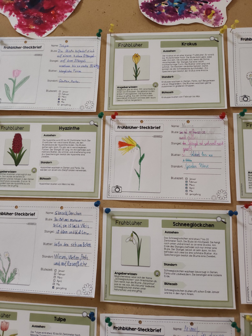 Besonders viel Freude bereitete das Verfassen von Postkarten: Ob an Freund:innen oder Familienmitglieder – mit lieben Grüßen und passenden Zeichnungen schickten die Kinder ihre Botschaften in die Welt. Passend zum Sachunterrichtsthema ging es schreibend weiter: Steckbriefe zu Frühblühern wie Tulpe, Krokus und Narzisse wurden gestaltet. Dabei lernten die Kinder interessante Fakten und übten gleichzeitig die strukturierte Darstellung von Informationen.